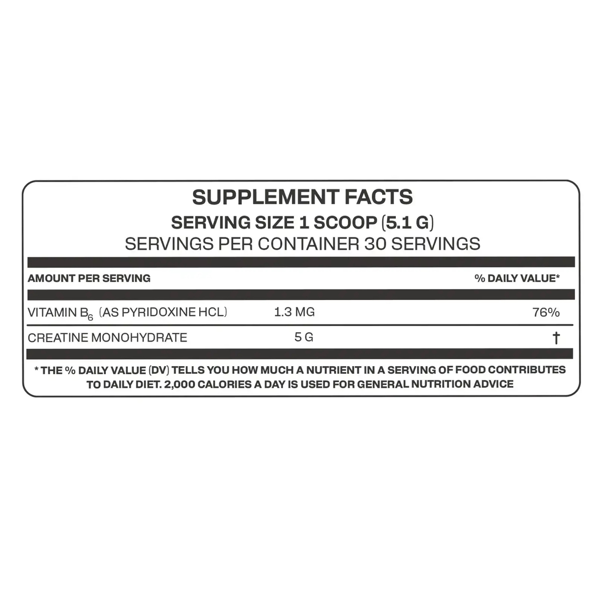 Це харчова спортивна добавка на основі креатину моногідрату та вітаміну B6, яка використовується для підвищення фізичної працездатності. Креатин допомагає організму накопичувати енергію в м’язах у вигляді креатинфосфату, завдяки чому під час тренувань зростають сила й витривалість та покращується відновлення після навантажень, а вітамін B6 сприяє кращому засвоєнню поживних речовин і зменшенню втоми.
